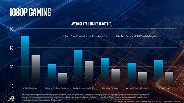 EU单元规模及先进技术的加入,使得Gen11核显的游戏性能比前代翻倍,48/64单元的Iris Plus核显可以保证多数游戏大作的平均帧率超过30FPS,部分还能突破60FPS,完全可以保证大部分游戏中的流畅体验。
